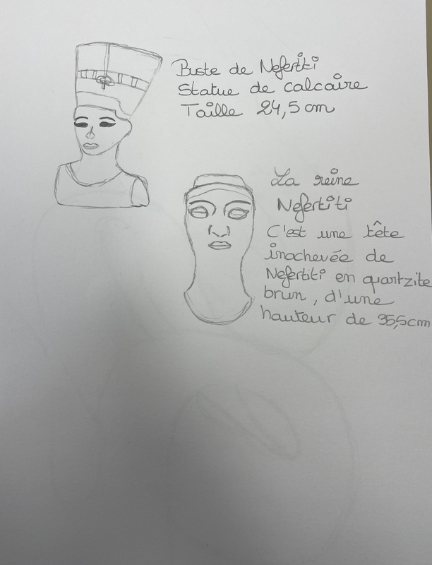 La tête de Néfertiti montre une sculpture arrêtée en pleine création:les traits sont esquissés,la surface est brute et aucun décor n'a encore été ajouté.Elle révèle la méthode de travail des artistes de l'époque.À l'inverse,le buste achevé présente un visage parfaitement modelé,symétrique et peint,offrant une image élégante de la reine.Ces deux pièces illustrent à la fois le processus de fabrication et le résultat final du savoir-faire égyptien.