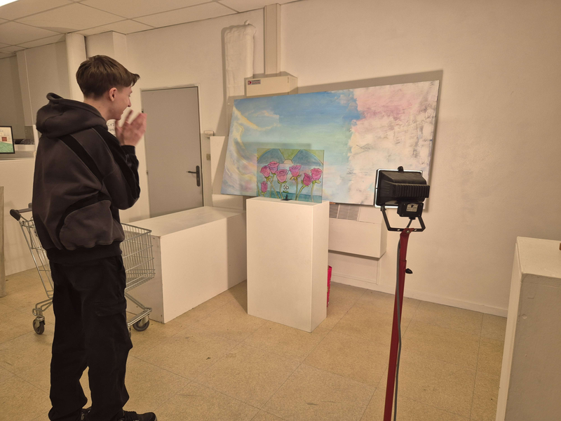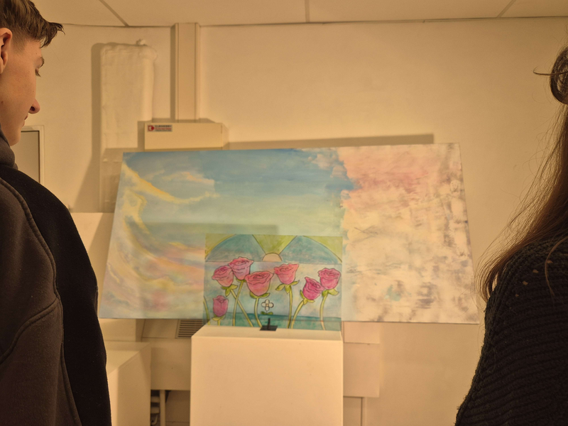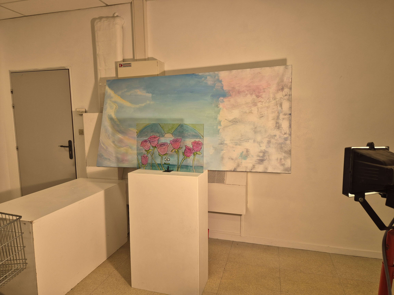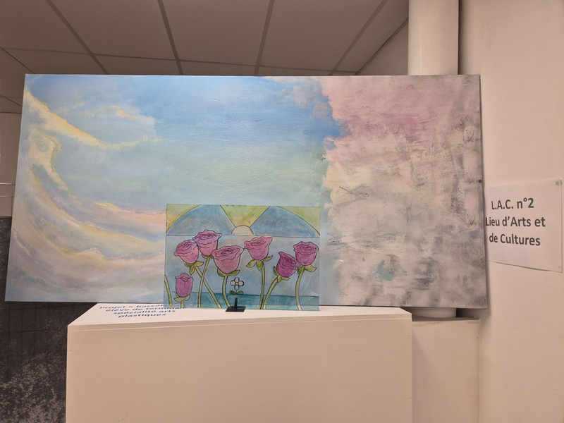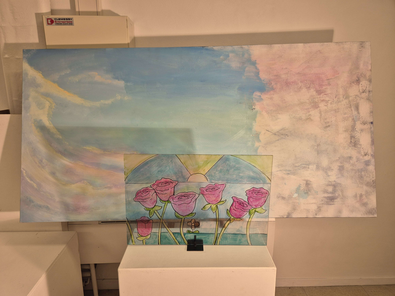Scénographie : vitrail placé devant le tableau posé sur un chevalet, projection de lumière pour faire refléter le vitrail sur la toile.