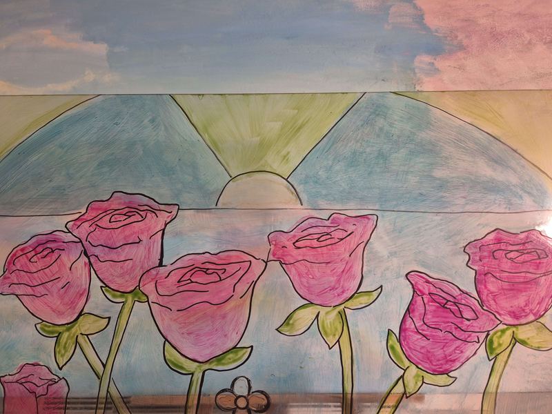 peinture acrylique sur une toile monumentale vitrail : peinture pour verre sur plexiglas, cernes tracées au posca