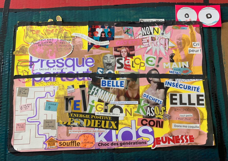 Photo 1/2. Projet: collage de magasine qui représente les travers de la société (= dérive de la religion/ mal traitance envers les enfants/ soumission et hyper sexualisation de la femme.