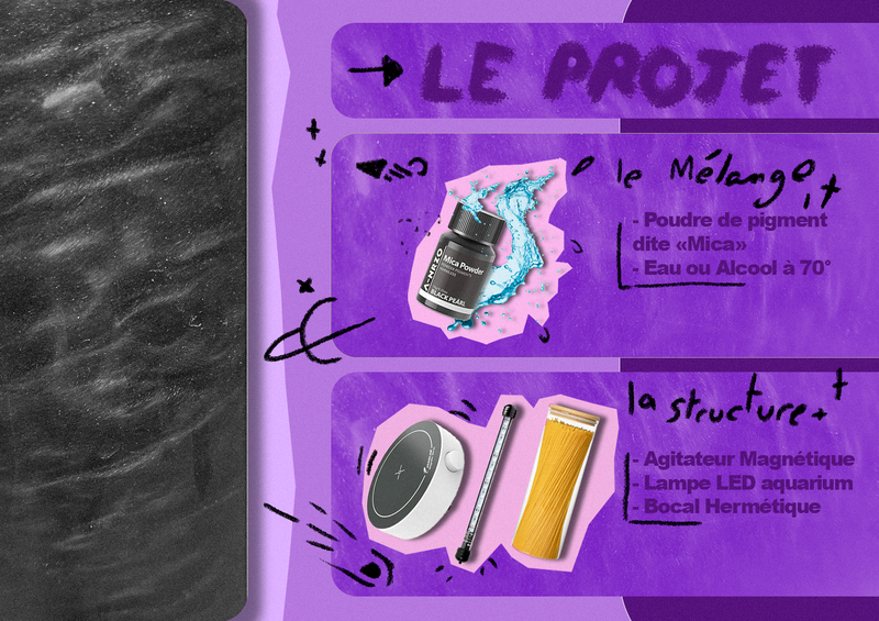 Dans le récipient se trouve un mélange mis en mouvement continu par l'agitateur magnétique, composé d’eau, de poudre pigmentée métallique dite MICA, et de paillettes. un trou est creusé au milieu du couvercle du bocal afin d’y glisser la lampe.
