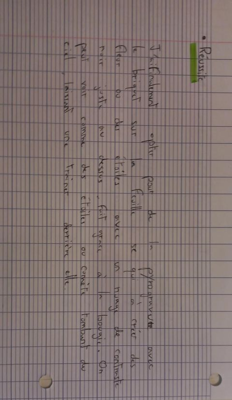 Le résultat a étais créer a partir de brulure et peut représenter des fleurs ou des étoiles tombant du ciel
